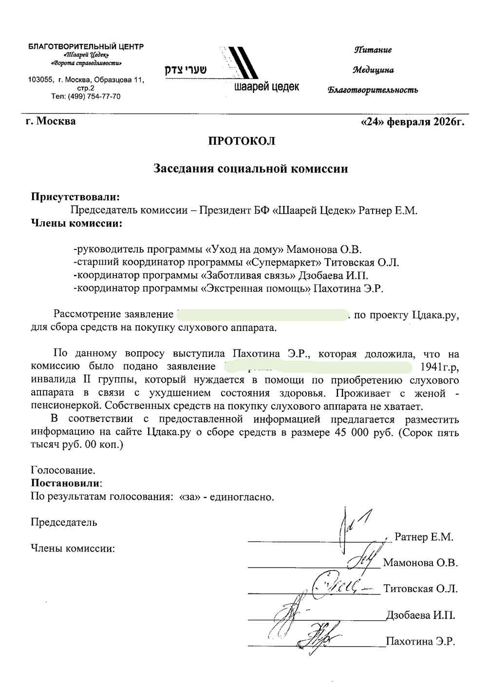 В благотворительный центр «Шаарей Цедек» обратился подопечный 1941 года рождения, инвалид II группы. Ему необходимо использовать слуховой аппарат, который, из-за тяжёлого материального положения, он себе не может позволить. Значительная часть их с женой пенсий уходит на приобретение лекарств и откладывать на слуховой аппарат у них нет возможности.
